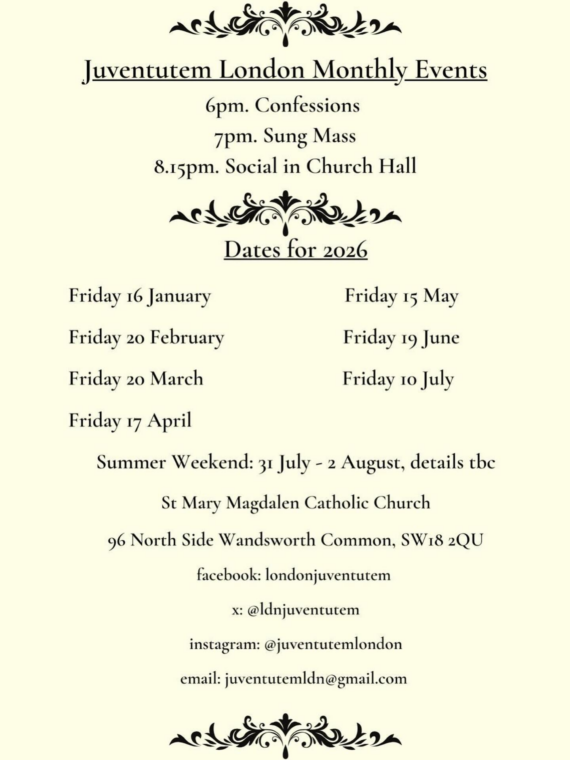 JuventutemLondon: for young men and women 18+; one Friday evening every month, 6pm Confessions,7pm Sung Mass with homily by Chaplain Fr de Malleray, 8pm social with Q&As. Next dates: 20 Feb, 20 Mar, 17 Apr, 15 May, 19 Jun, 10 Jul.
