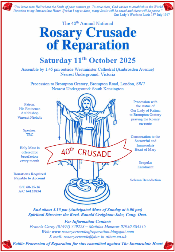 40th edition of the London ROSARY CRUSADE in reparation for the sins committed against the Immaculate Heart. On Sat 11th October, join thousands of pilgrims including children, for an easy one-hour walk. Meet at 1:45pm outside Westminster Cathedral (along Ambrosden Avenue). Arrive for Marian devotions at the Brompton Oratory. Ends by 5:15pm. Our Chaplaincy cubs, wolvets, scouts and guides will walk together as part of the Crusade, wearing their uniforms. Families and individual pilgrims welcome! Free.